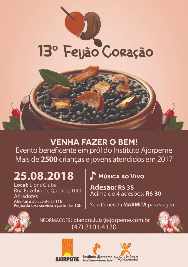 No próximo sábado, dia 25, o Núcleo Jovem Empreendedor da Ajorpeme realiza a 13ª edição do Feijão Coração O evento tem como objetivo arrecadar fundos para os programas do Instituto Ajorpeme. Em 2017, mais de 2.500 crianças e jovens participaram de iniciativas como o Miniempresa, em que vivenciam o dia a dia de um micro […]