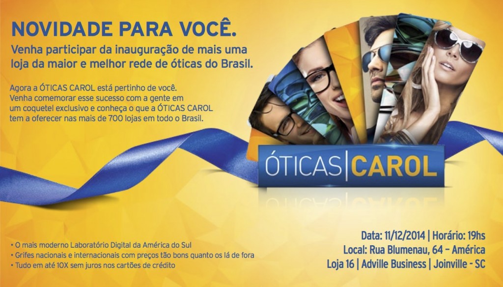 Os jovens empresários paulistas Daniel Castello, Renato Pires e Bruno Vellozo inauguraram no dia 11 de dezembro com coquetel para convidados, blogueiras, oftalmologistas e imprensa a 1ª franquia da Óticas Carol em Joinville, localizada na Rua Blumenau, 64. A loja que trará opções exclusivas e licenciadas em armações como Prada, Marc Jacobs, Ray-Ban, Swarovski e muitas […]
