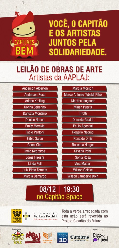 Hoje é o grande dia do LEILÃO BENEFICENTE “CIDADÃO DO FUTURO”, às 19h30, no Capitão Space, à Rua Marques de Olinda, 3340, em Joinville. Na ocasião mais de 30 obras doadas por artistas de Joinville e região, estarão à venda com preços abaixo do valor de mercado para presentear neste Natal e ajudar mais de […]