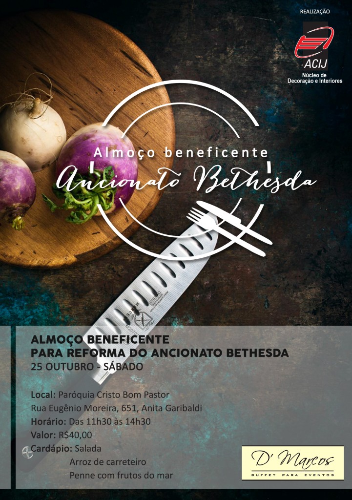 O Núcleo de Decoração e Interiores da Acij vai realizar neste sábado, dia 25, a partir das 11h30, na Paróquia Cristo Bom Pastor, um almoço beneficente para angariar fundos para reformar uma sala de atividades do Ancionato Bethesda. No cardápio salada, arroz de carreteiro e penne com frutos do mar, tudo especialmente elaborado pelo D’Marcos […]