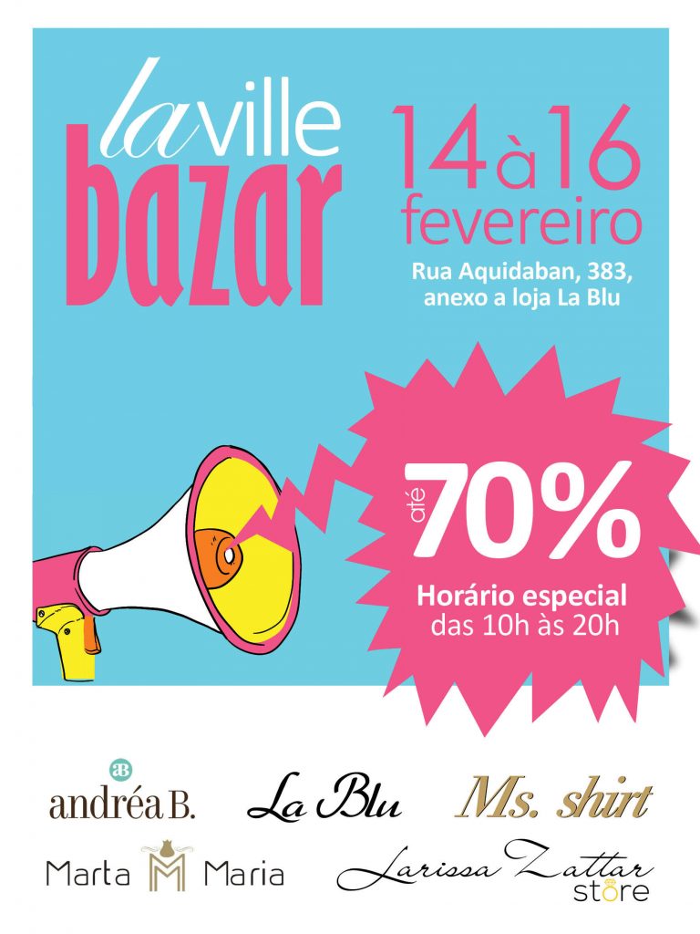 Essa semana, nos dias 14,15 e 16, acontecerá mais uma edição do LA VILLE BAZAR, onde as marcas Andréa B Atelier, La Blu Moda Íntima, Larissa Zattar Store, Marta Maria Calçados e Ms Shirt estarão reunidas para o já tradicional MEGA BAZAR de Verão. Vamos prestigiar?