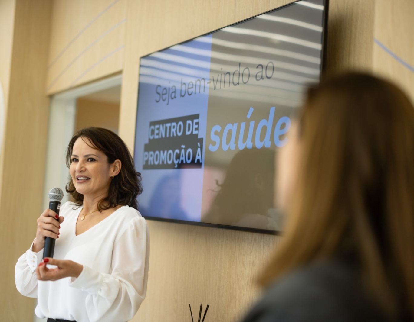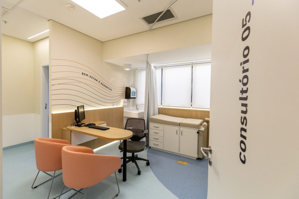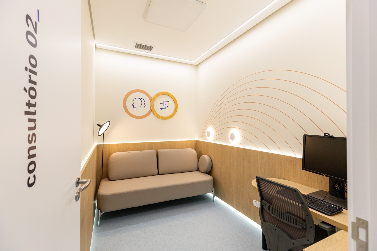 O espaço promove saúde e bem-estar com ambientes integrados, incluindo clínica e sala de amamentação